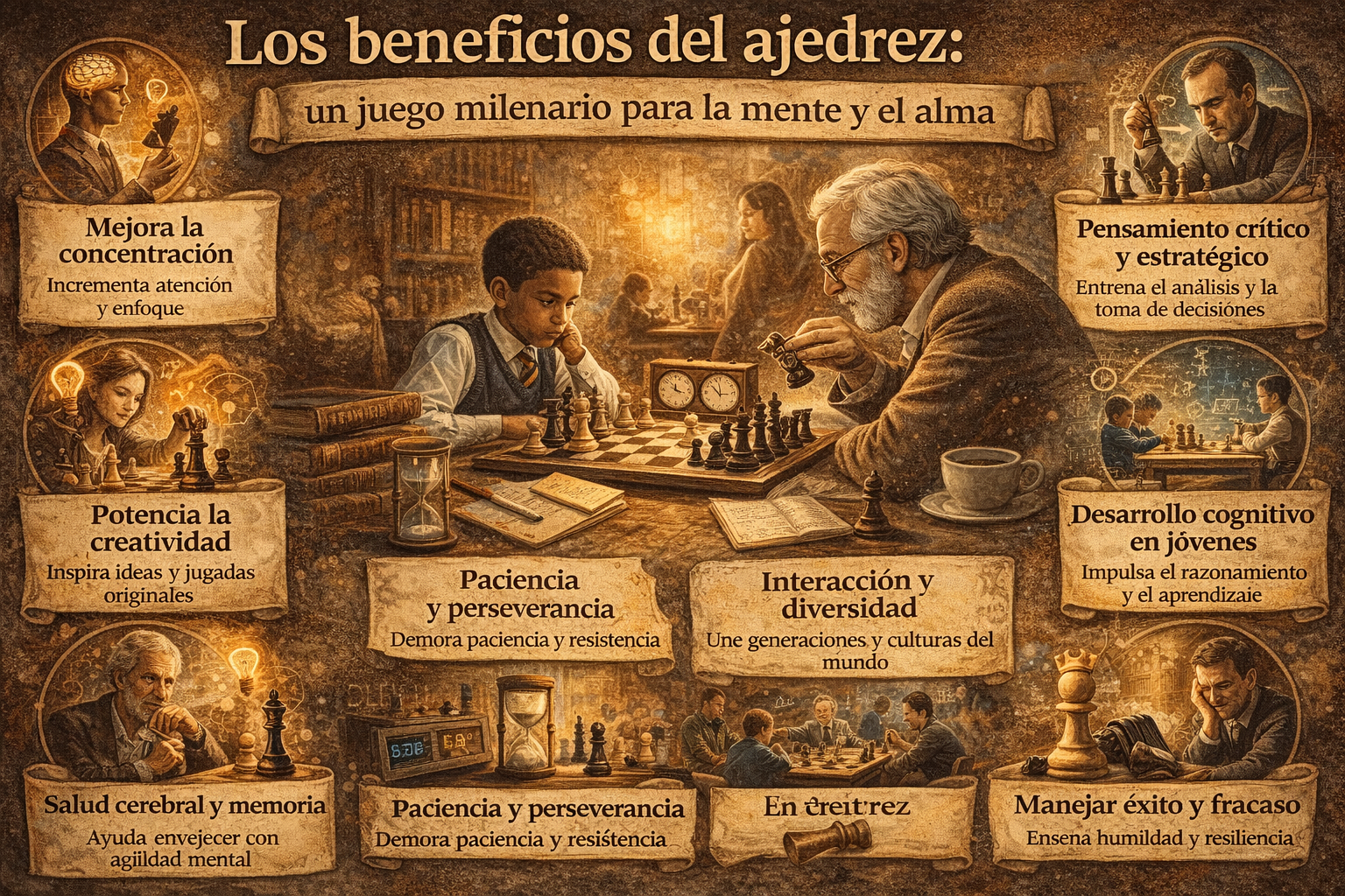 El ajedrez fortalece mente y carácter: te hace pensar, decidir y aprender. Por eso sigue creciendo: porque en un mundo acelerado, el tablero te obliga a ir profundo.