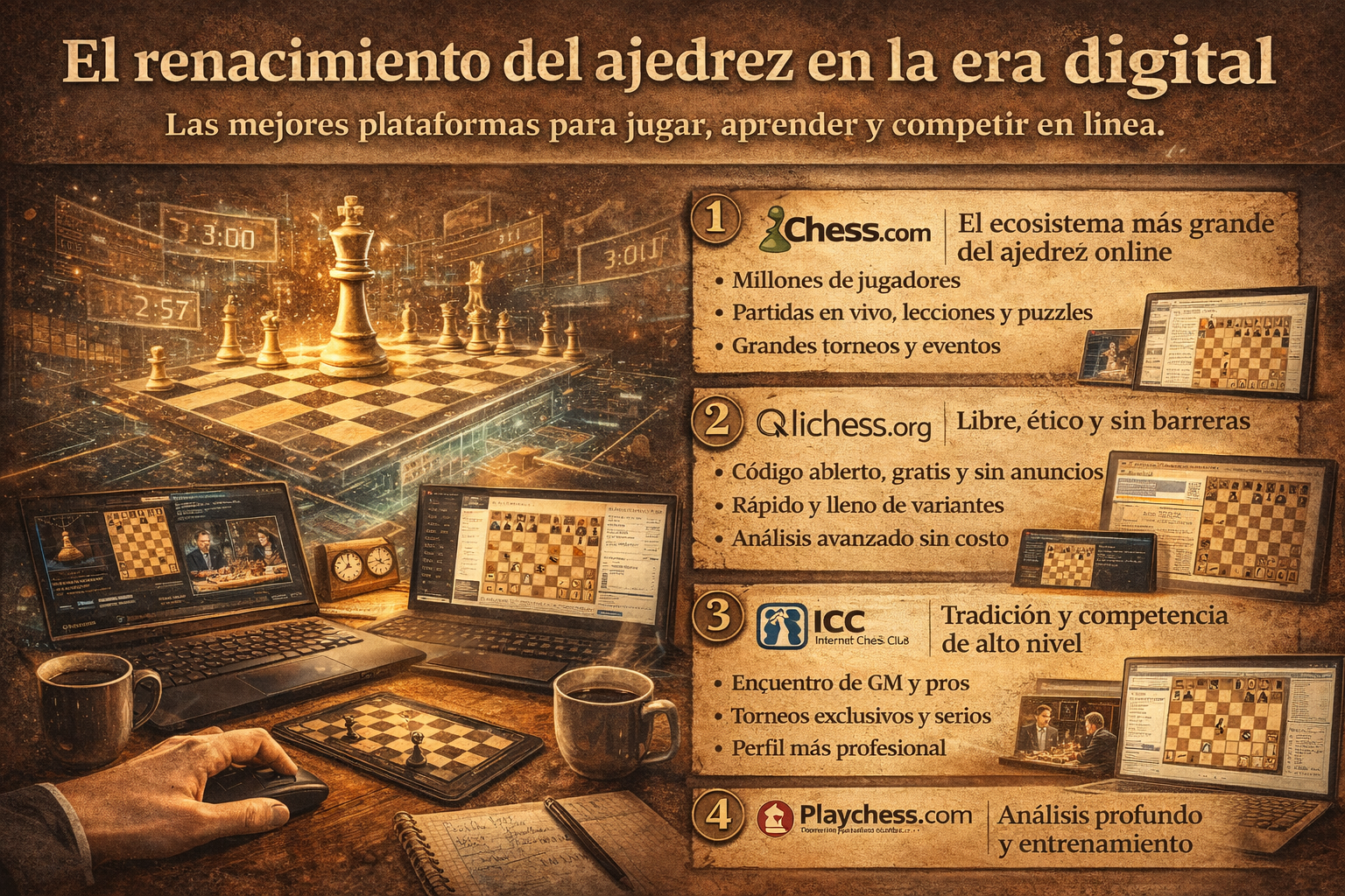 La era digital no solo revitalizó el ajedrez: lo volvió global. Hoy el tablero es infinito, el aprendizaje es inmediato y el rival perfecto está a un clic. Elige tu plataforma según tu objetivo: diversión, mejora o competencia.