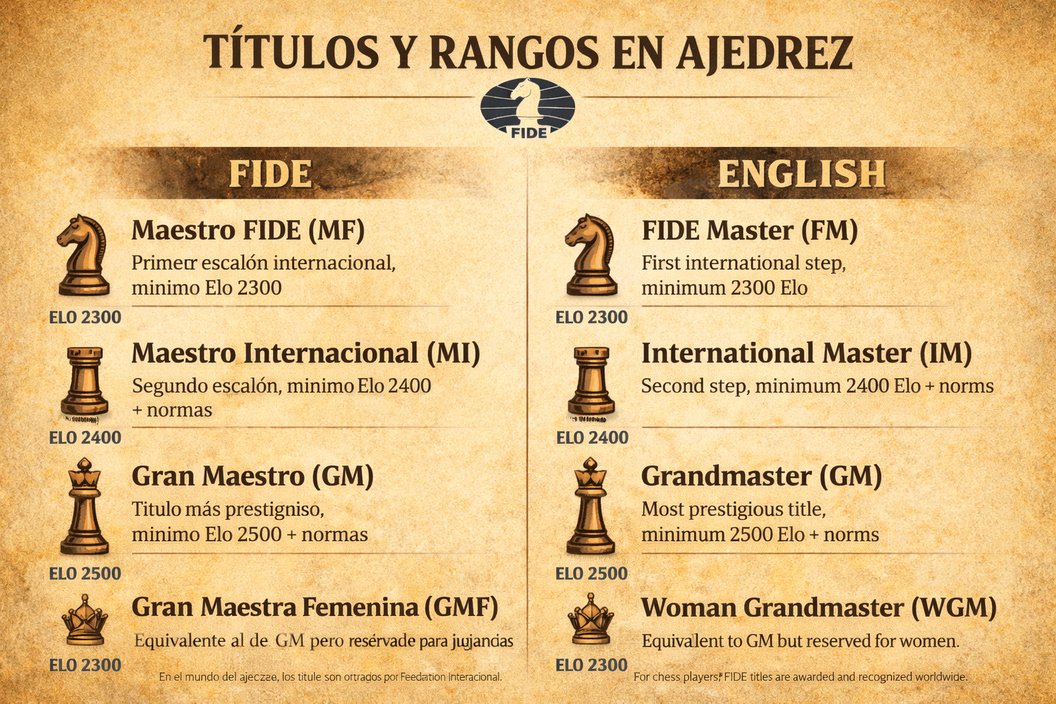 Una guía rápida para entender MF, MI, GM y títulos femeninos: requisitos de Elo y por qué importan.